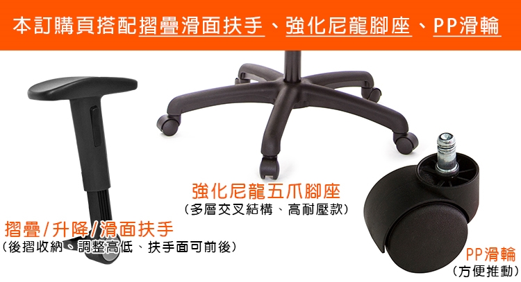 本訂購頁規格:摺疊升降/滑面扶手、尼龍腳座、PP滑輪