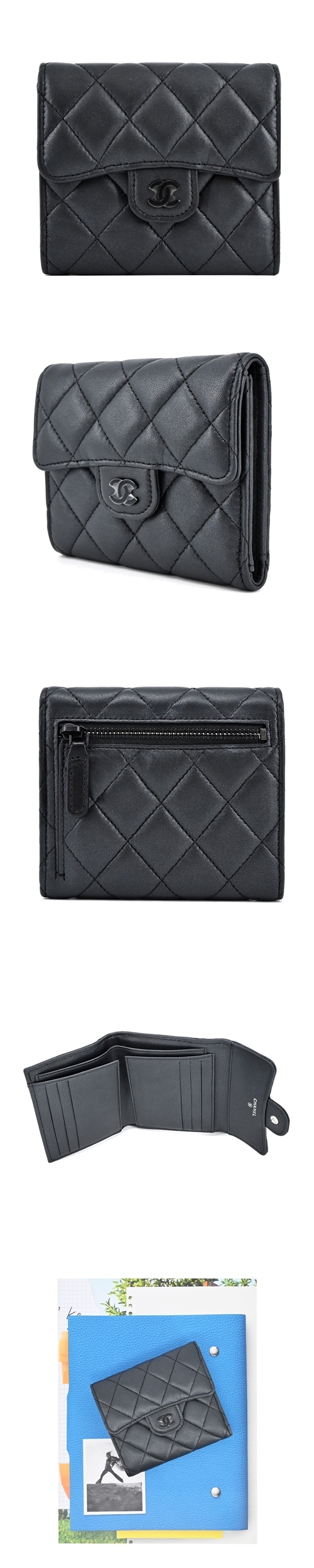 CHANEL 經典雙C金屬菱格紋小羊皮翻蓋三折短夾(黑色)