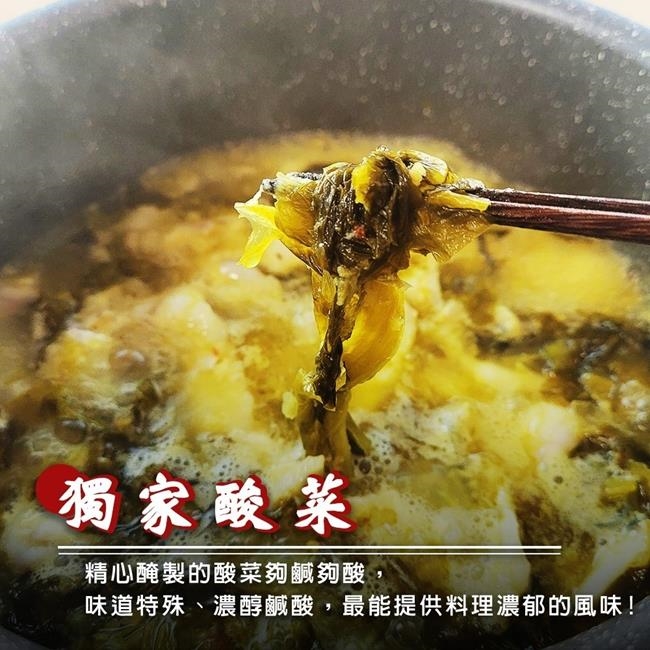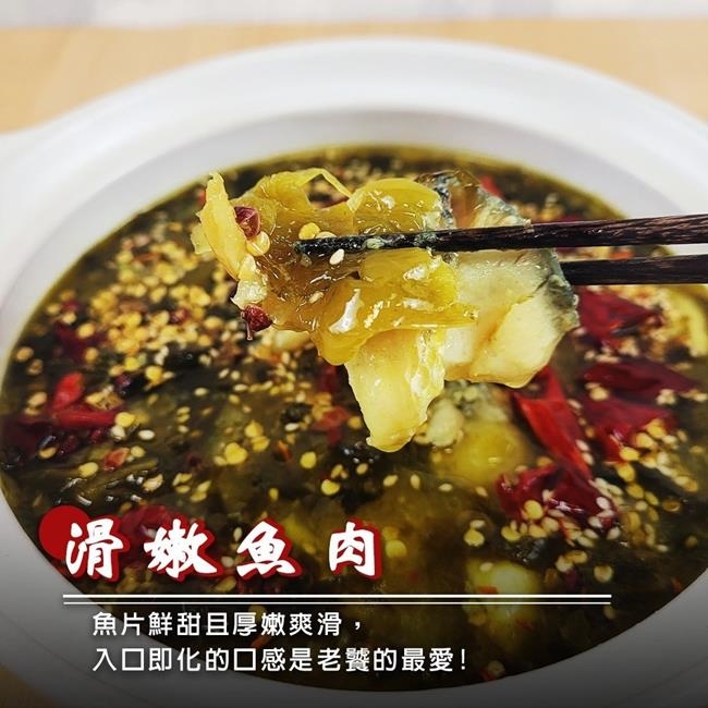 成分:烏鱧魚片〔烏鱧魚、水、玉米澱粉、大豆油、鹽、白砂糖、味精、混合劑(多磷酸鈉、焦磷酸鈉、磷酸氫二鈉、磷酸氫二鉀、磷酸氫鈉、檸檬酸鈉、碳酸鈉)〕、老壇酸菜{芥菜、大豆油、鹽、生薑、大蒜、辣椒、釀造醬油、香辛料(八角、花椒、草粿、川芎)、食品添加物〔L-麩酸鈉、5'-鳥㗚呤核苷磷酸二鈉、5'-次黃㗚呤核苷磷酸二鈉、乳酸、防腐劑(山梨酸鉀)、辣椒紅色素〕}、調味醬{大豆油、醃小米辣椒〔水、小米辣椒、鹽、偏亞硫酸氫鈉、防腐劑(苯甲酸鈉)、冰醋酸、檸檬酸〕、醃蘿蔔〔蘿蔔、小米辣椒、高良薑、白砂糖、檸檬酸、冰醋酸、防腐劑(山梨酸鉀)〕、味精、醃薑〔嫩薑、飲用水、食用鹽、防腐劑(山梨酸鉀)、檸檬酸、冰醋酸、抗氧化劑(異抗壞血酸鈉)、偏亞硫酸氫鈉〕、雞精調味料〔玉米澱粉、雞肉粉、白砂糖、麥芽糊精、食用鹽、食品添加劑(L-麩酸鈉、5'-鳥㗚呤核苷磷酸二鈉、食用香料)〕、大蒜、生薑、鹽、白砂糖、料酒(水、大米、L-麩酸鈉、食用鹽、焦糖色素)、釀造醋、香辛料、(白胡椒粉、薑黃粉)、5'-鳥㗚呤核苷磷酸二鈉、5'-次黃㗚呤核苷磷酸二鈉、食用箱料}、辣椒花椒包(辣椒、花椒)、芝麻