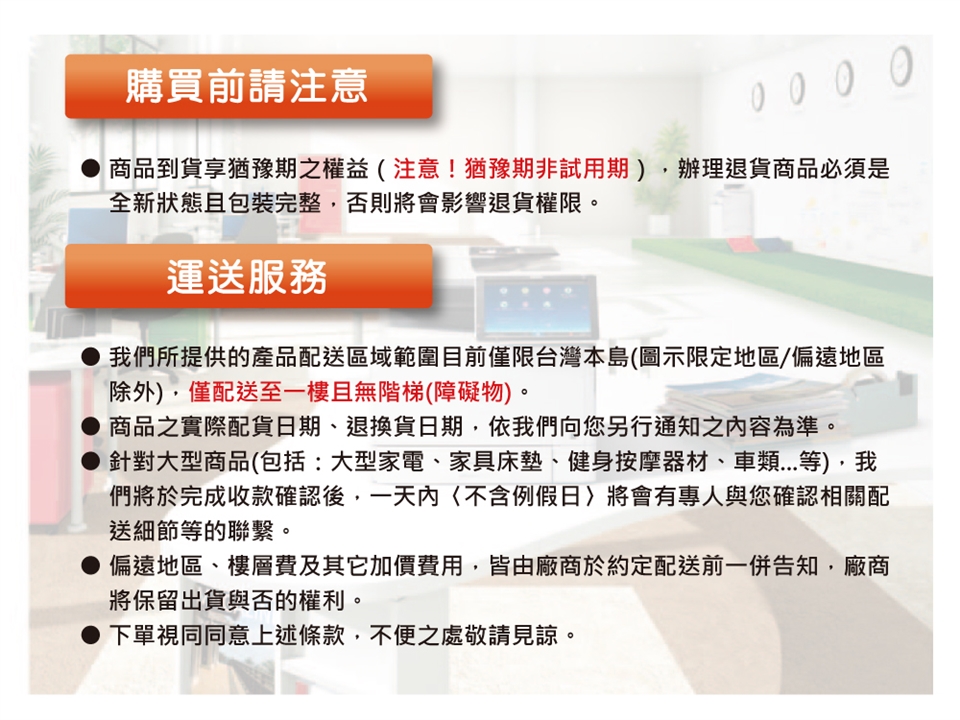 ■ 偏遠地區、樓層費及其它加價費用,皆由廠商於約定配送時一併告知,廠商將保留出貨與否的權利。