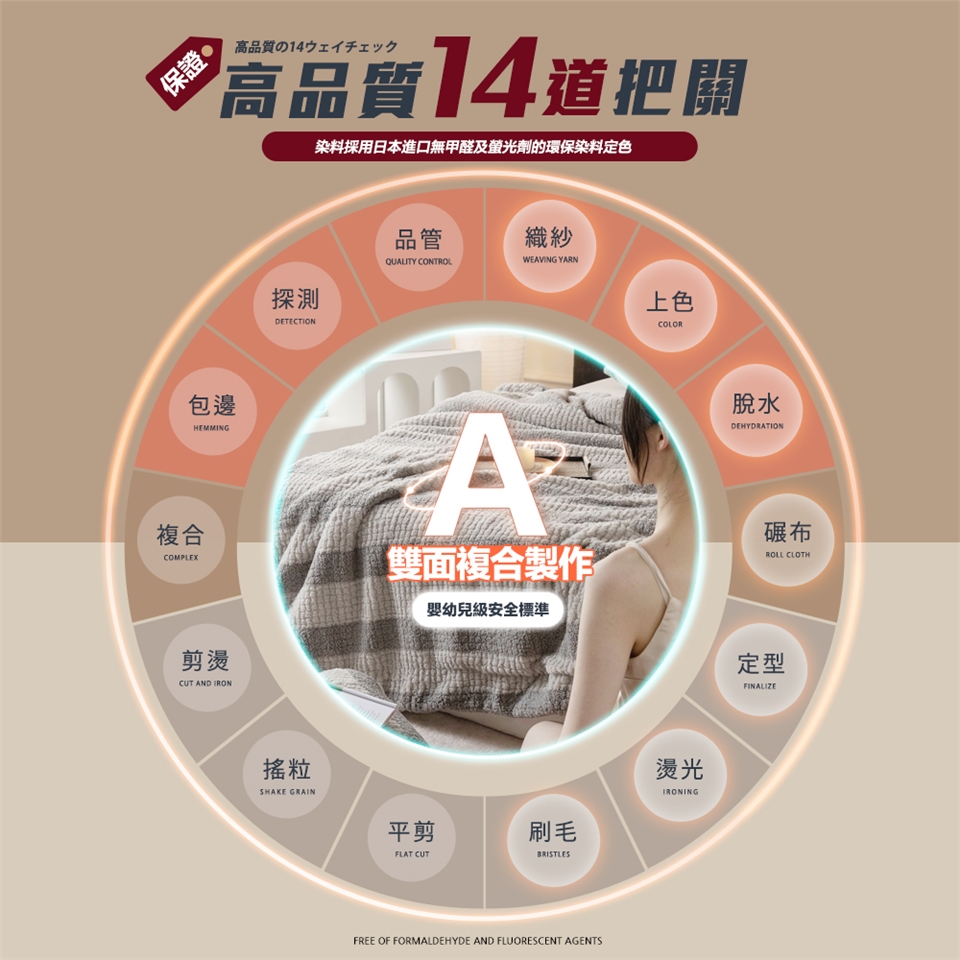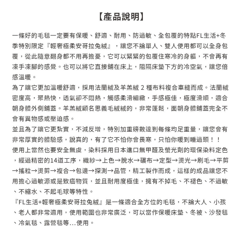 由於作工繁瑣,出廠前有平剪程序,也就是剛做好的絨料,絨面的絨毛長度長短不一,為使其更加舒適美觀會以此一工序將其絨毛長度修剪整齊,因此您收到的產品可能會有平剪後所殘留的絨毛,新品收到時可先至空曠處將殘留毛料拍打掉再行使用,但此非掉毛,為避免不必要的誤會。