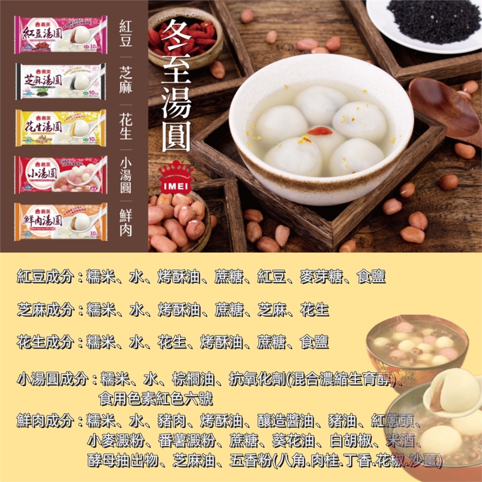 葷素別: 芝麻/花生/紅豆/小湯圓:純素- ; 鮮肉湯圓:葷食-