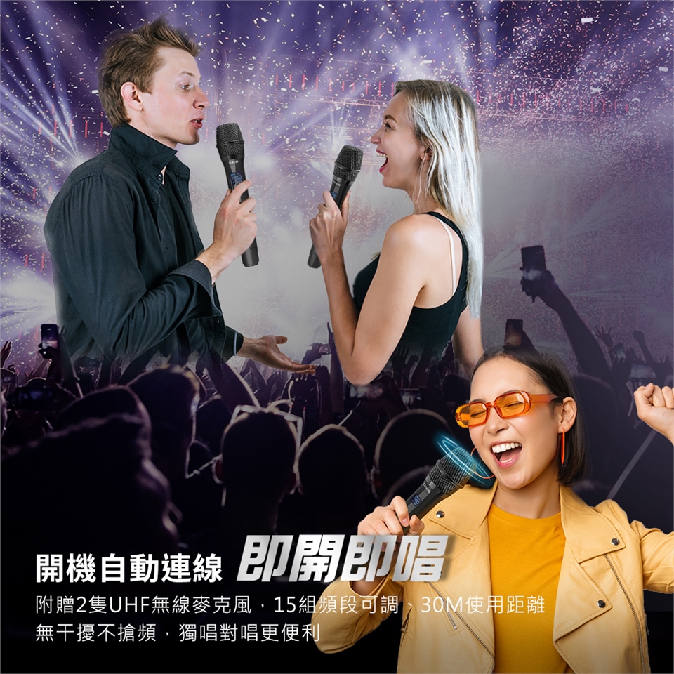 附贈兩隻無線MIC,15組頻道可調,輕鬆歡唱不搶頻