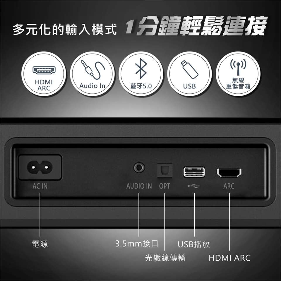 支援藍牙/USB/Aux-in/HDMI (ARC)/Optical光纖等音訊模式