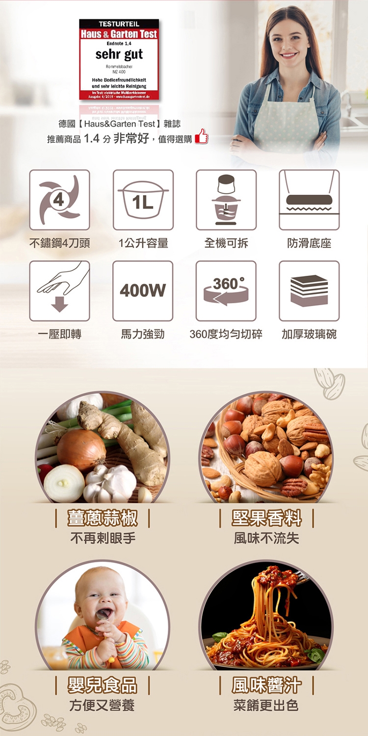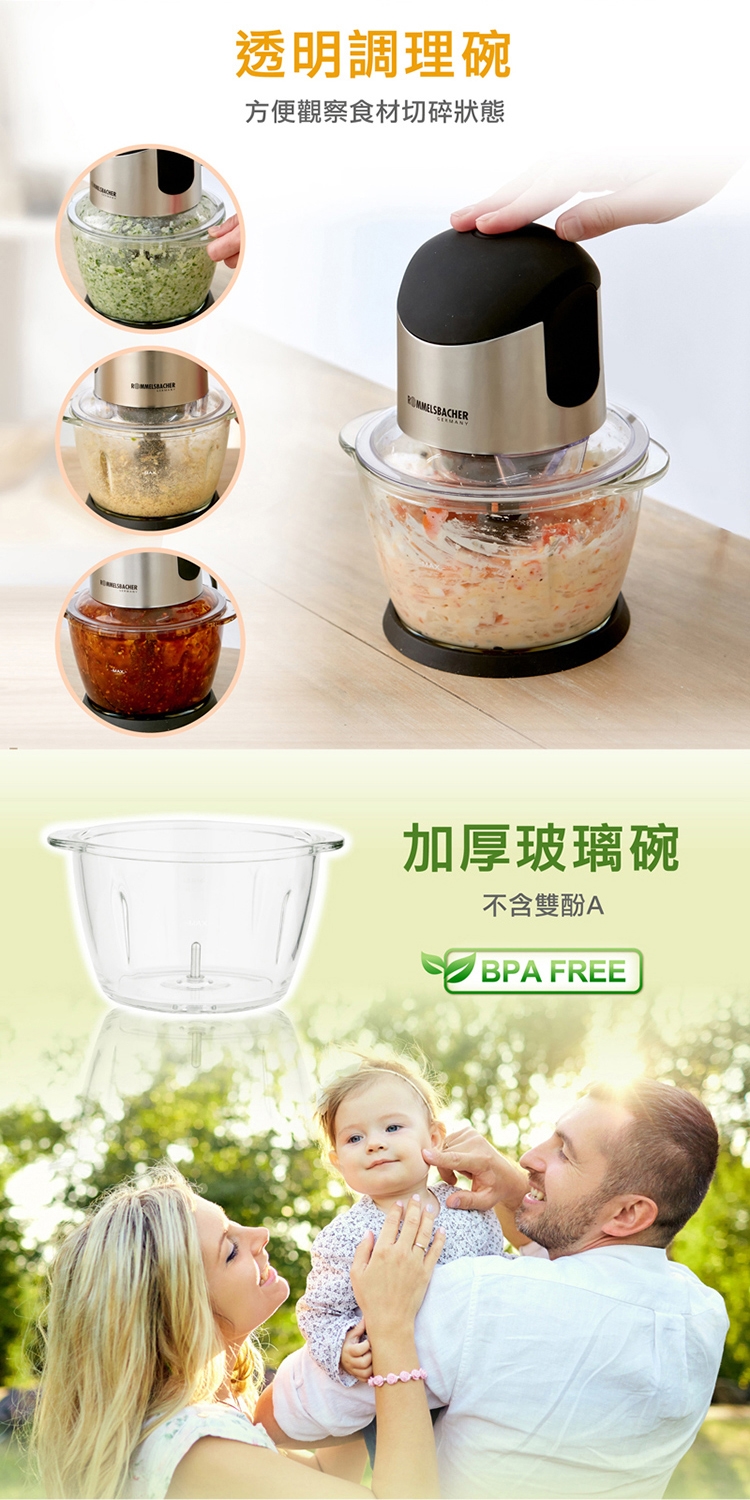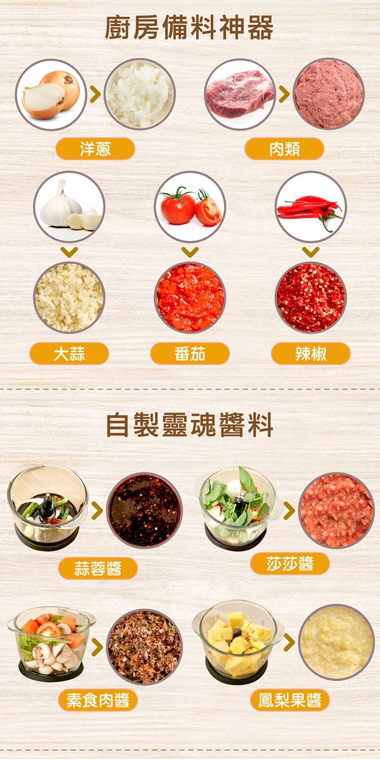快速製作出生菜沙拉、各類醬汁、香蒜抹醬,或是各式香料等,備料更快速。一鍵就上手,省時又便利。