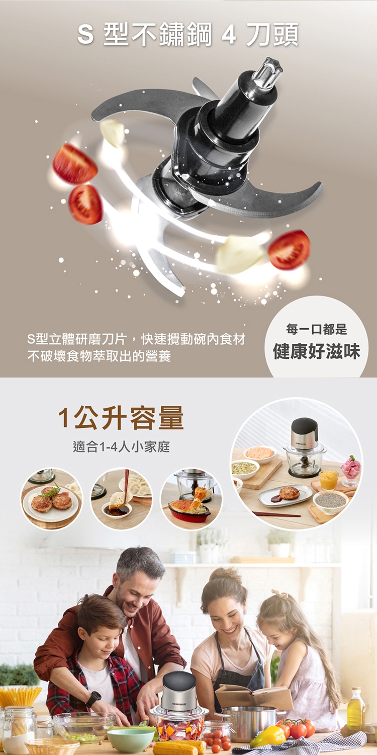 鋒利的S型立體研磨刀片由4片不鏽鋼刀片組成,切碎攪拌更細膩均勻!