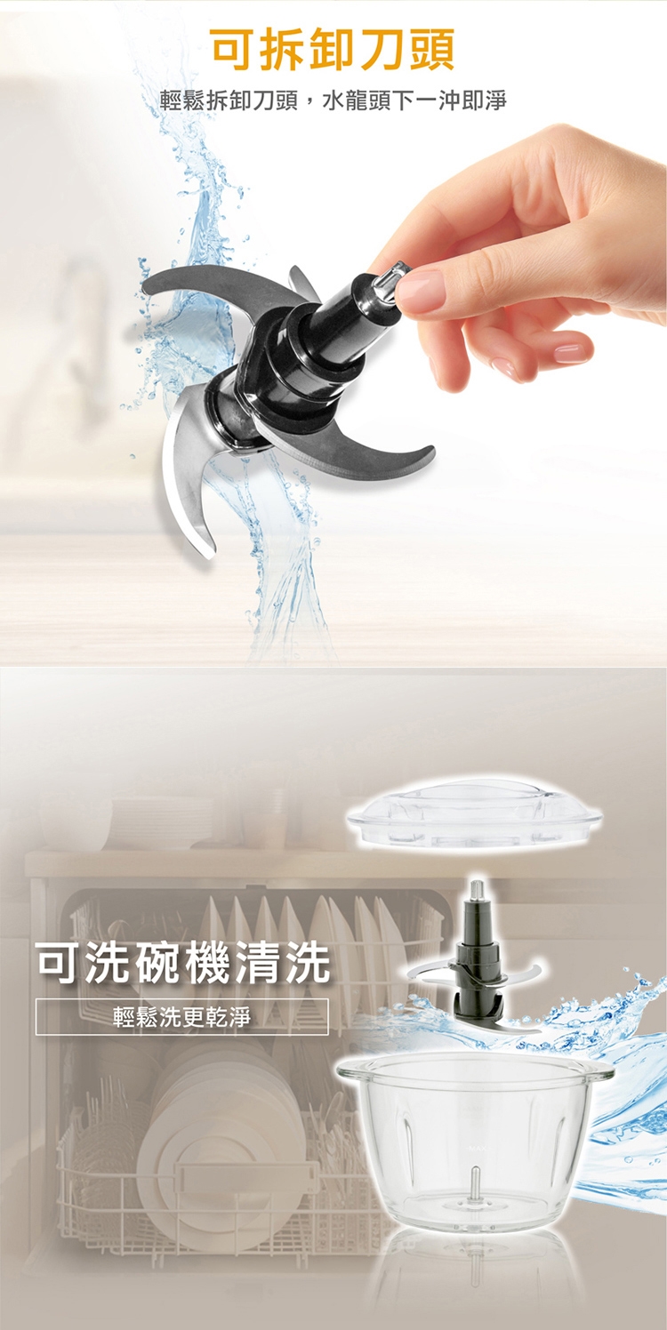 強勁高轉速馬達、安全卡扣設計,確保使用的安全性。配件可使用洗碗機清洗,清潔到位使用更安心
