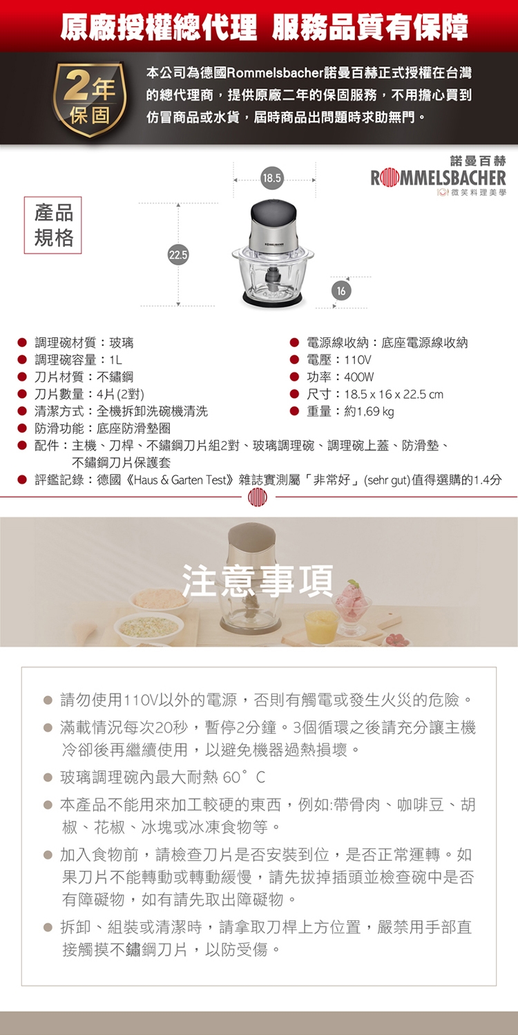 配件:主機、刀桿、不鏽鋼刀片組2對、玻璃調理碗、調理碗上蓋、防滑墊、不鏽鋼刀片保護套