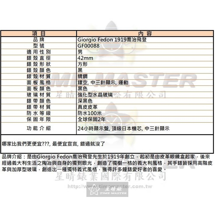 是由Giorgio Fedon喬治飛登先生於1919年創立,起初是由皮革眼鏡盒起家,後來經過義大利生活之陶冶與自身的獨到眼光,創造了獨樹一格的義大利風格,其手錶皆採用高階皮革與加厚型玻璃,創造出一種獨特義式風格,獲得許多鐘錶愛好者的喜愛。
