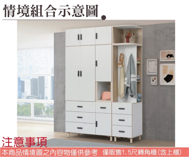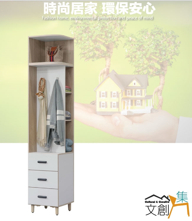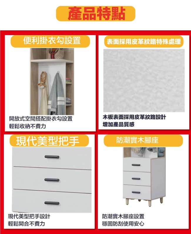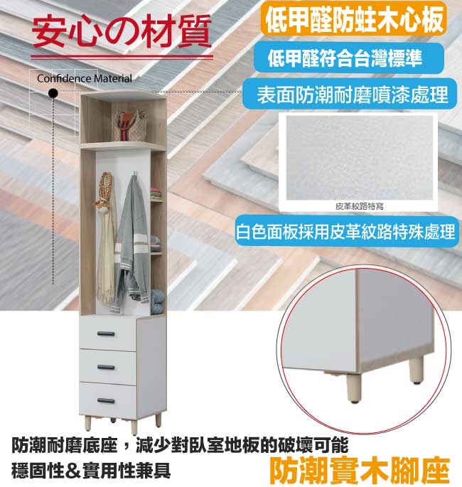 【文創集】葛依亞1.5尺三抽側邊加高衣櫃組合 米白皮革紋色系+現代簡約風格+安心材質製造,使用放心+搭配居家更便利,整體採用防蛀木心板(面板採用皮革紋路處理)+防潮實木腳座+五金滑軌結構等材質搭配外層採用優莉坦耐磨全包式噴漆處理 ,採用衣物收納掛鉤+三抽屜+開放層格等收納空間設計,全由專人配送到家,專業安心服務,替你省下更多時間!