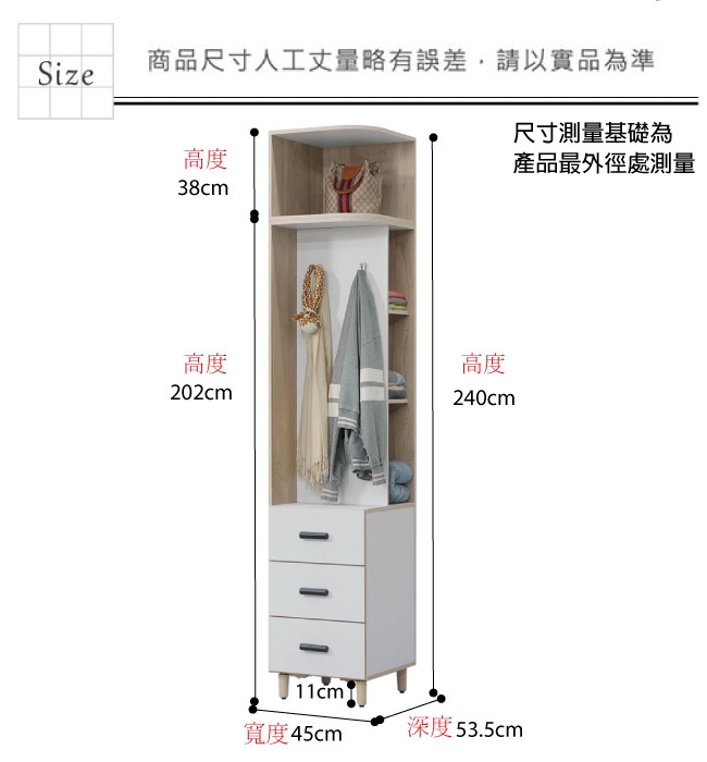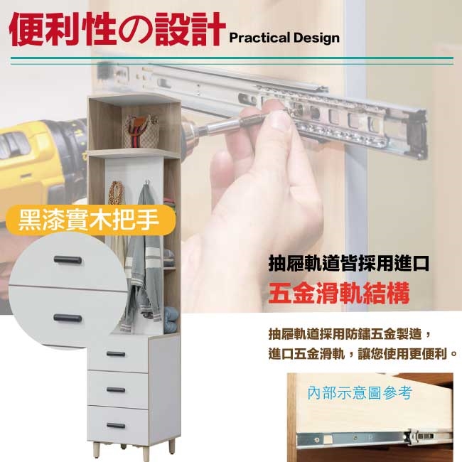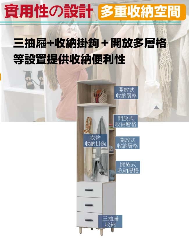 採用衣物收納掛鉤+三抽屜+開放層格等收納空間設計