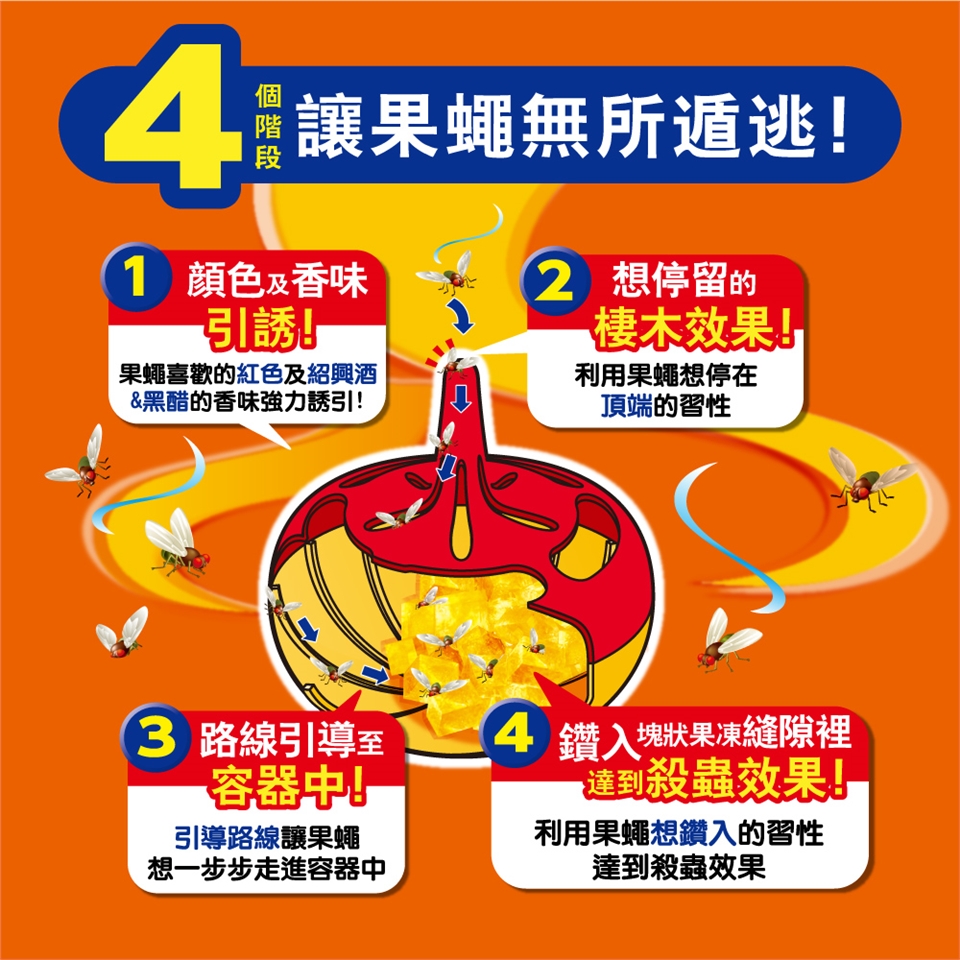 ●食物殘渣或水分等為果蠅的食物來源,事先整理清潔,誘殺效果更好。