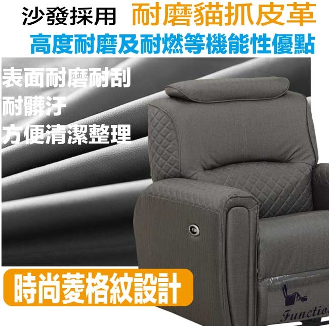 【文創集】拜亞迪貓抓皮革機能性單人座沙發(電動開關調整) 時尚灰色系+現代美型外觀+安心材質設計,就是這種頂級質感的設計,能輕鬆地融入各種空間風格,採用防鏽鋼管骨架+防鏽不鏽鋼五金結構+耐磨貓抓皮革+高回彈性加厚泡棉等安心材質製造,品質安心有保障,現在購買專人送到府服務,免組裝+免運費,讓你省時省力省運費!