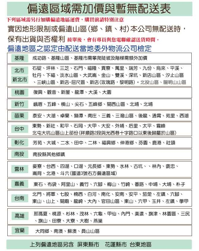 1.實因特殊地型限制及(山區、濱海鄉、鎮、村、區)無法送貨時,本公司保有出貨與否之權利(下單後會由專人告知是否可配送)。