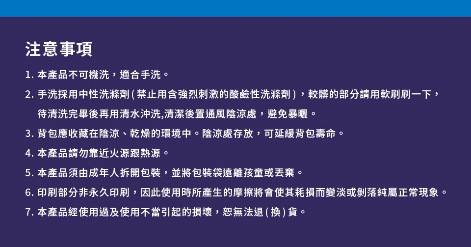 7.本產品經使用過及使用不當引起的損壞,恕無法退(換)貨。