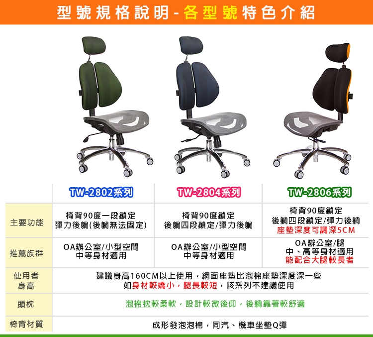 TW-2804高背款雙背椅,本款使用中型灰網面座墊,適合身高160~185CM使用者,椅背採用人體工學設計,造型看似烏魚子、或是像兩個人體肺的型狀,這樣的設計,是讓我們在乘坐後靠時,能更貼合我們背部,緩和脊椎的重力,降低尾椎壓力,給長時間工作者一張,聰明、會改善坐姿習慣的智慧椅。