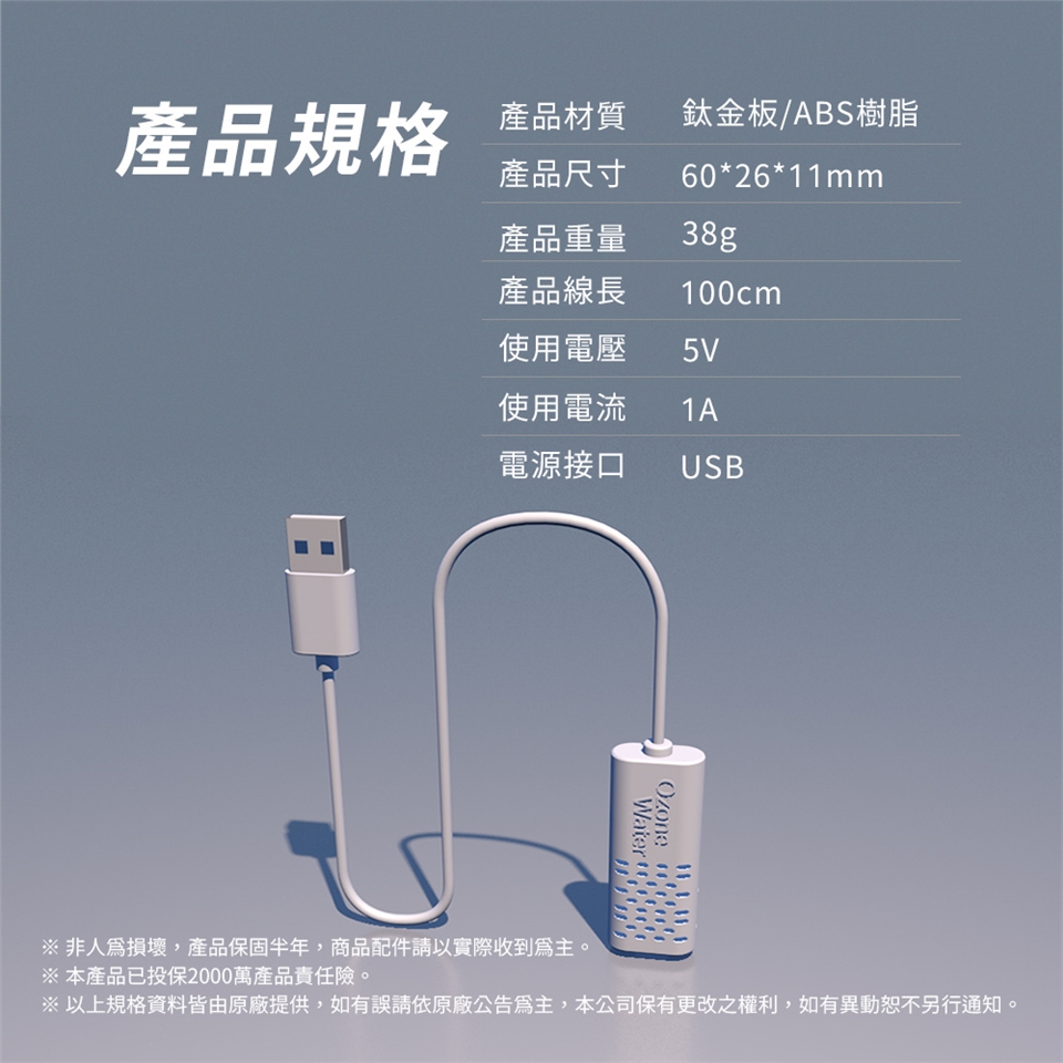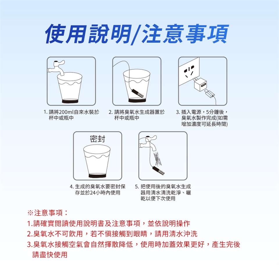 使用方式:杯子加入200cc自來水,放入臭氧生成器,接入5V/1A電源,靜待5分鐘即可(加蓋子效果更好)