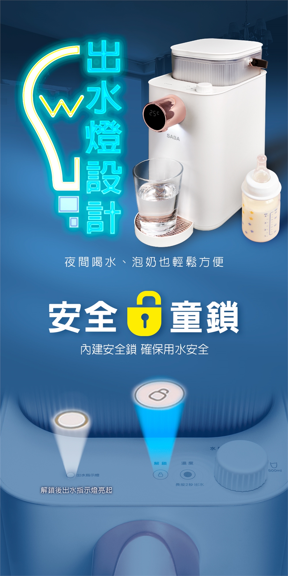 ◆出水口小夜燈,夜間使用超方便