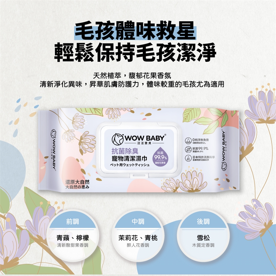 ✅專為毛孩設計抗菌99.9%除臭柔濕巾,蘊含馥郁花果香氛,清新淨化異味,昇華寵物肌膚防護力!