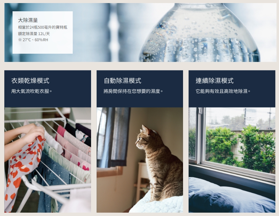 12公升大除濕量 - 額定除濕量12L/天,相當於24瓶500毫升的寶特瓶