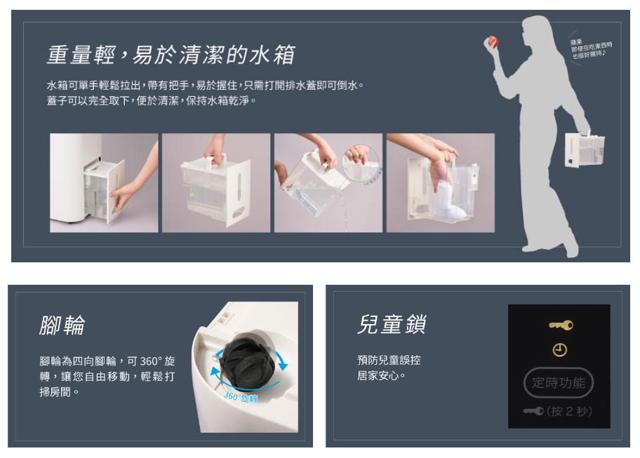 重量輕,易於清潔的水箱 - 水箱可單手輕鬆拉出,帶有把手,易於握住,蓋子可完全取下,便於清潔,保持水箱乾淨