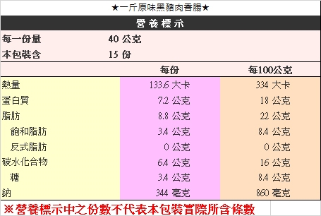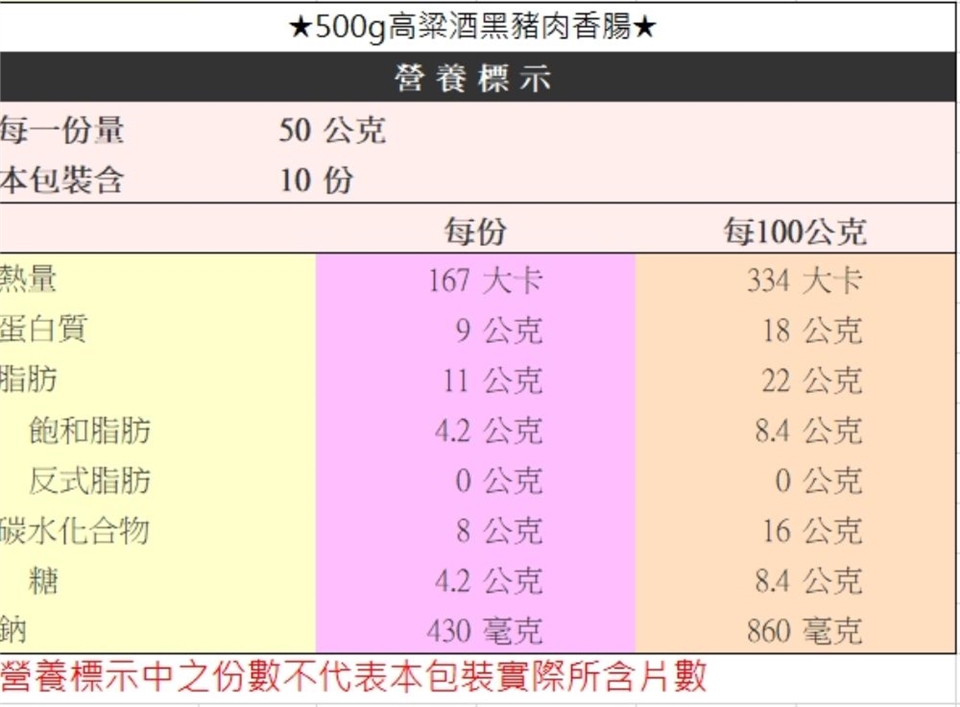 內容物:黑豬肉、豬背脂、糖、豬腸衣(法國)、調味劑(L-麩酸鈉)、甜味劑(D-山梨醇液70%)、高粱酒(高粱、小麥)、食鹽、調味劑(乳酸鈉液)、複方保色劑[食鹽、保色劑(亞硝酸鈉、硝酸鉀)、麥芽糊精]、甘草水(水、甘草)、肉精(水、鹽、基改大豆蛋白、L-麩酸鈉、豬油、豬肉抽出物、雞肉抽出物、中鏈三酸甘油酯、麥芽糊精、醬油、洋蔥、胡蘿蔔抽出物、糖、葡萄糖、脂肪酸甘油酯、大白菜、胺基乙酸、木糖、乳酸硬脂酸鈉、脂肪酸蔗糖酯、焦糖色素、香料、5'-次黃嘌呤核苷磷酸二鈉、5'-鳥嘌呤核苷磷酸二鈉、L-苯丙胺酸、DL-胺基丙酸、琥珀酸二鈉、酵母抽出物、水解大豆蛋白、玉米糖膠、關華豆膠、L-異白胺酸、L-脯胺酸、葵花油、脂肪酸山梨醇酐酯、辣椒抽出物、L-天門冬酸鈉、檸檬酸鈉、L-精胺酸、丙二醇、乙醇、白菜抽出物)、結著劑(焦磷酸鈉、多磷酸鈉)、薑粉、複方品質改良劑[調味劑(胺基乙酸)、醋酸鈉(無水)、酵素製劑(溶菌酶)]、抗氧化劑(L-抗壞血酸鈉)、蒜抽出物(大豆油、蒜頭抽出物)、甜味劑(甘草素、甘草萃)、五香粉(肉桂、小茴香、甘草、花椒、八角)、香草粉(肉桂、丁香、五加皮、小茴香、山奈)、調味劑(dl-胺基丙酸)