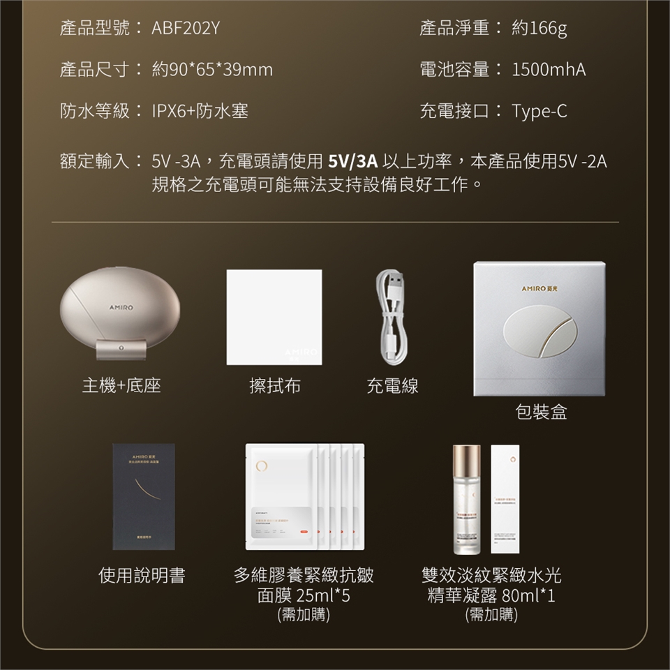 包裝內容物:本機、充電底座、Type-C充電線、擦拭布、使用說明書 / 面膜*5片 / 凝露*1罐