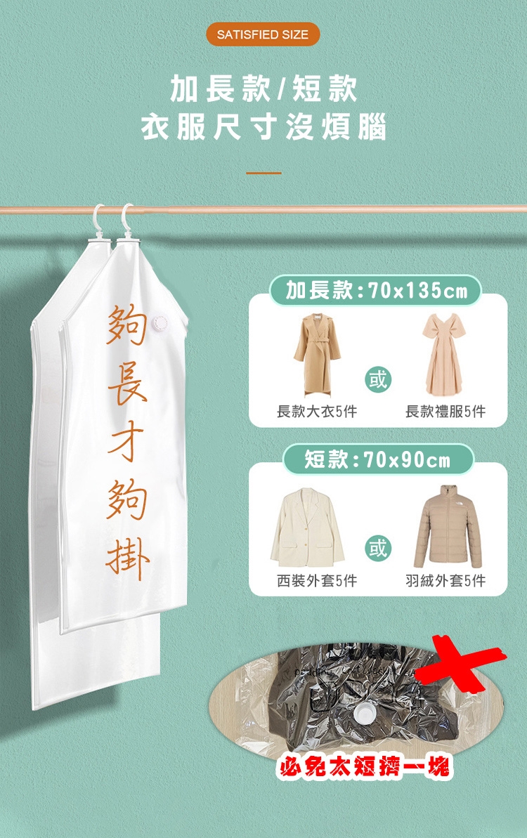 還再用舊式需拔開塞頭的真空袋嗎?升級款懸掛式壓縮真空袋,旋轉即開關,省時又便捷,二用壓縮抽氣/手壓吸氣都OK!,升級直排5孔掛環,一次可掛五件大衣,加厚材質使用更長久,加長尺寸大衣全收納,新創可拆式掛勾,大型棉被也能壓縮收納,美觀清晰白底衣物清礎可見,要用就用最完美的懸掛式壓縮真空袋!