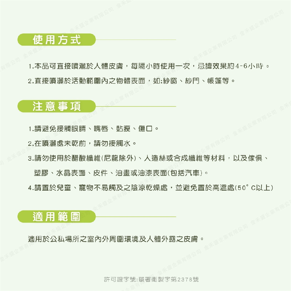 1.產品可直接噴灑於人體皮膚,每隔4-6小時使用一次,忌避效果約4-6小時。