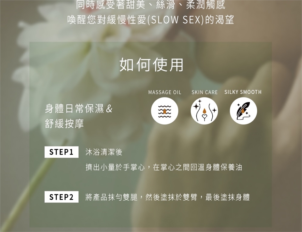 調和7款天然精油與10款天然植物基底優油獨家配方, 給予肌膚更柔潤的觸感, 喚醒妳我的深層慾望