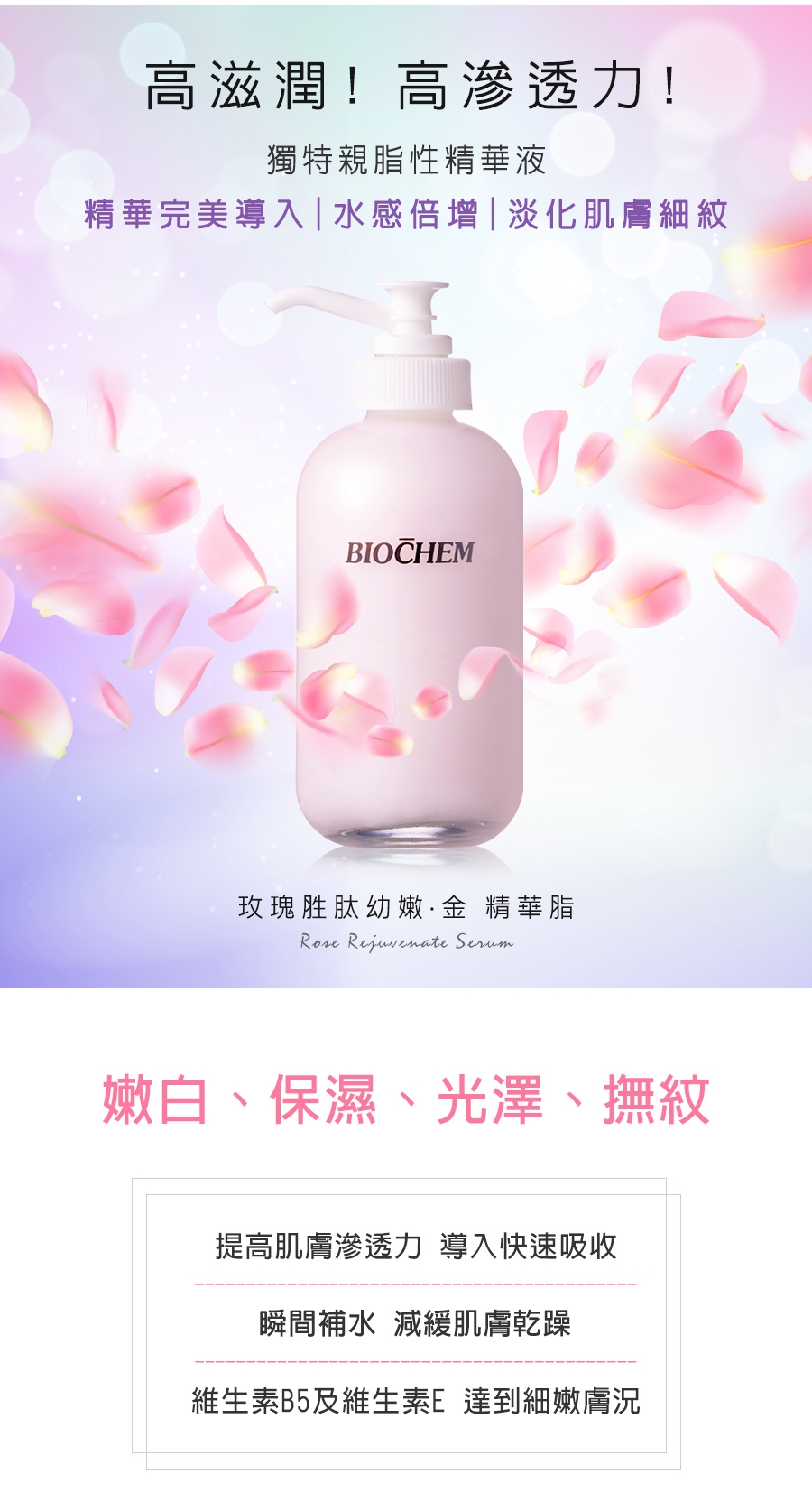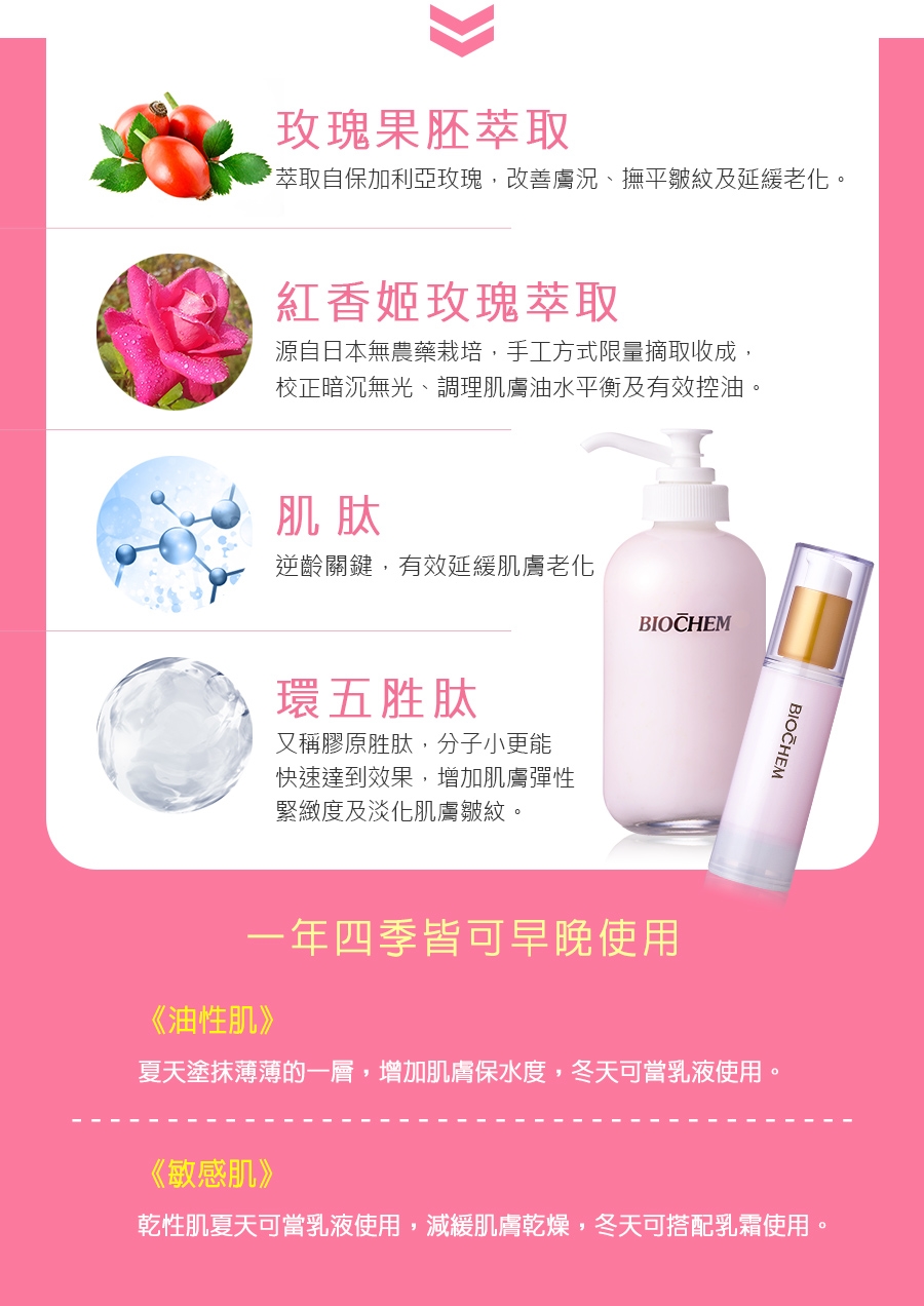 主成分:玫瑰花水、玫瑰果胚萃取、營實萃取、紅香姬萃取、肌肽、環五胜肽。