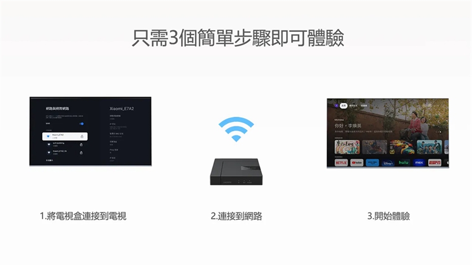 盒子插上電源線、HDMI線接上電視、再來開機選擇語言,連接網路(有線or無線WIFI),配對藍牙語音遙控器後即可使用