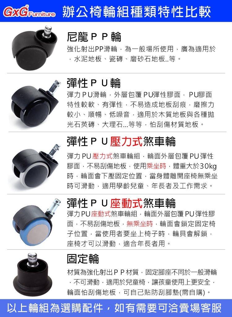 GXG家具產品,在您購買使用多年以後,零配件(椅背、扶手、坐墊、輪組..等等),需要維修、更換,都能買的到,一張好的椅子能夠使用很久,永續經營服務,環保、不浪費,愛地球從你我開始。