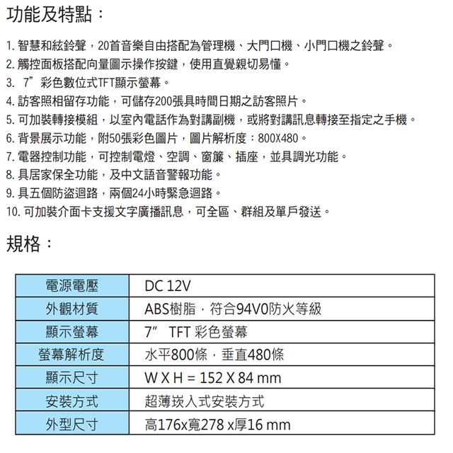 -訪客照相留存功能,可儲存200張具時間日期之訪客照片。