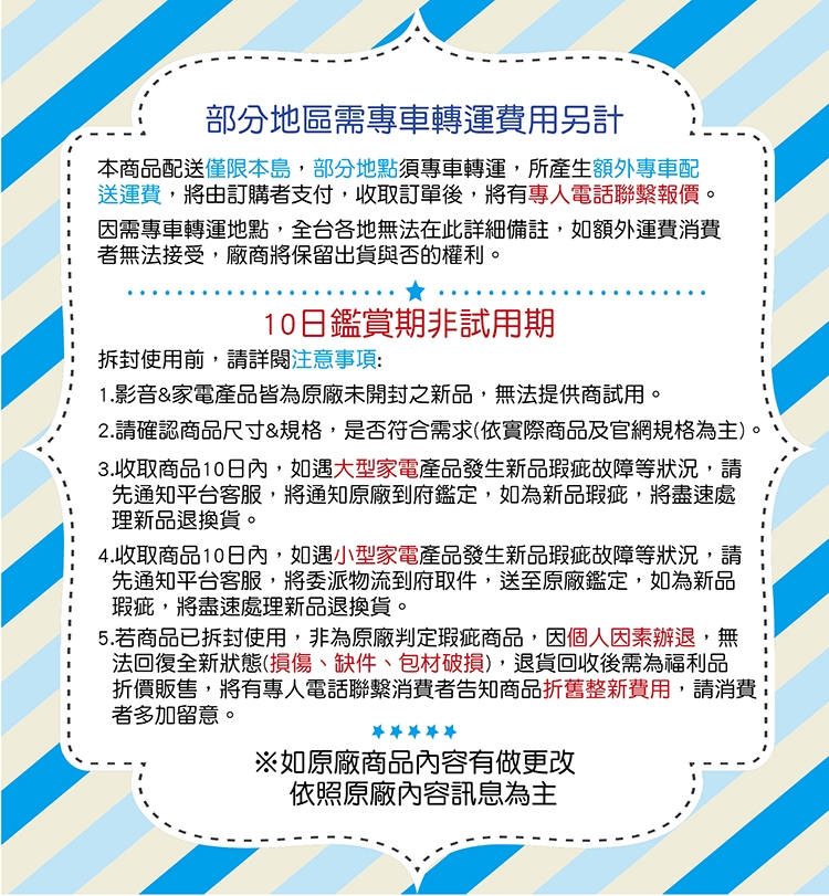 107.4.1 日起:購買冷氣機全產品,全機保證三年、壓縮機(含冷媒)保證十年,變頻窗型冷氣機變頻基板保證七年(不含顯示基板、接收基板)。