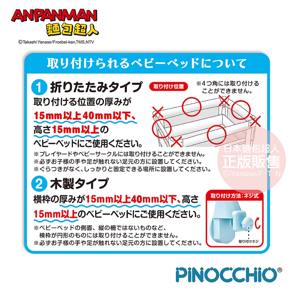 ※請勿安裝在嬰兒床的四角;※不適用安裝在遊戲床及嬰兒圍欄上;