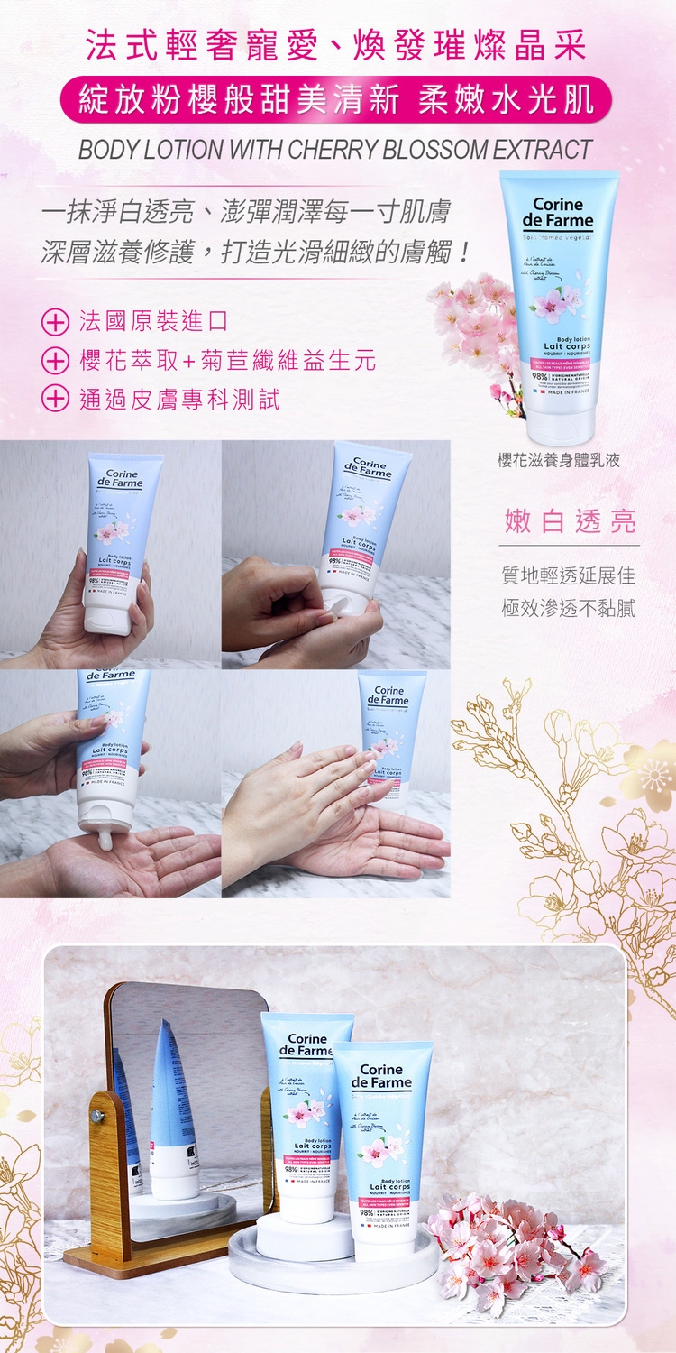含櫻花萃取精華具保濕嫩白、舒緩修護肌膚的絕佳功效。