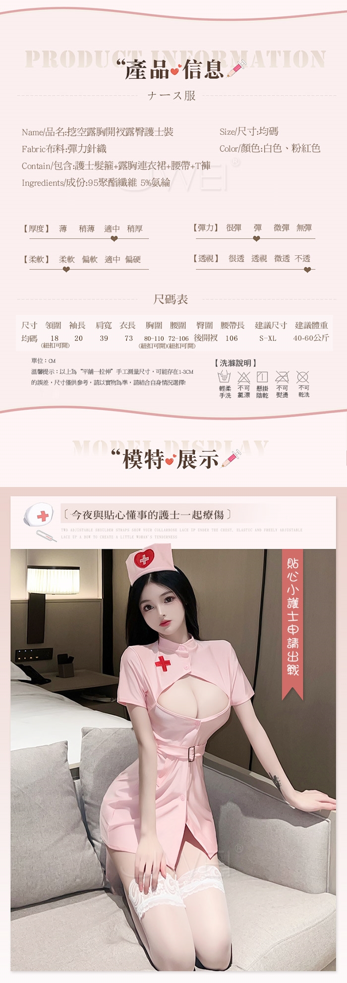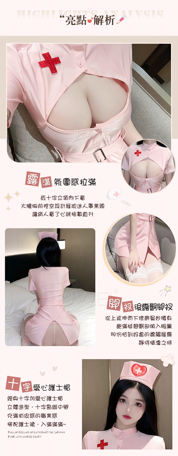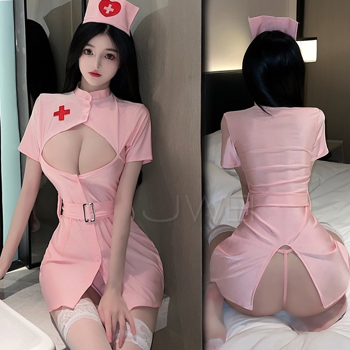 ◇◆貼身小護士.挖空露胸開衩露臀護士裝4件組(白/粉)◆◇