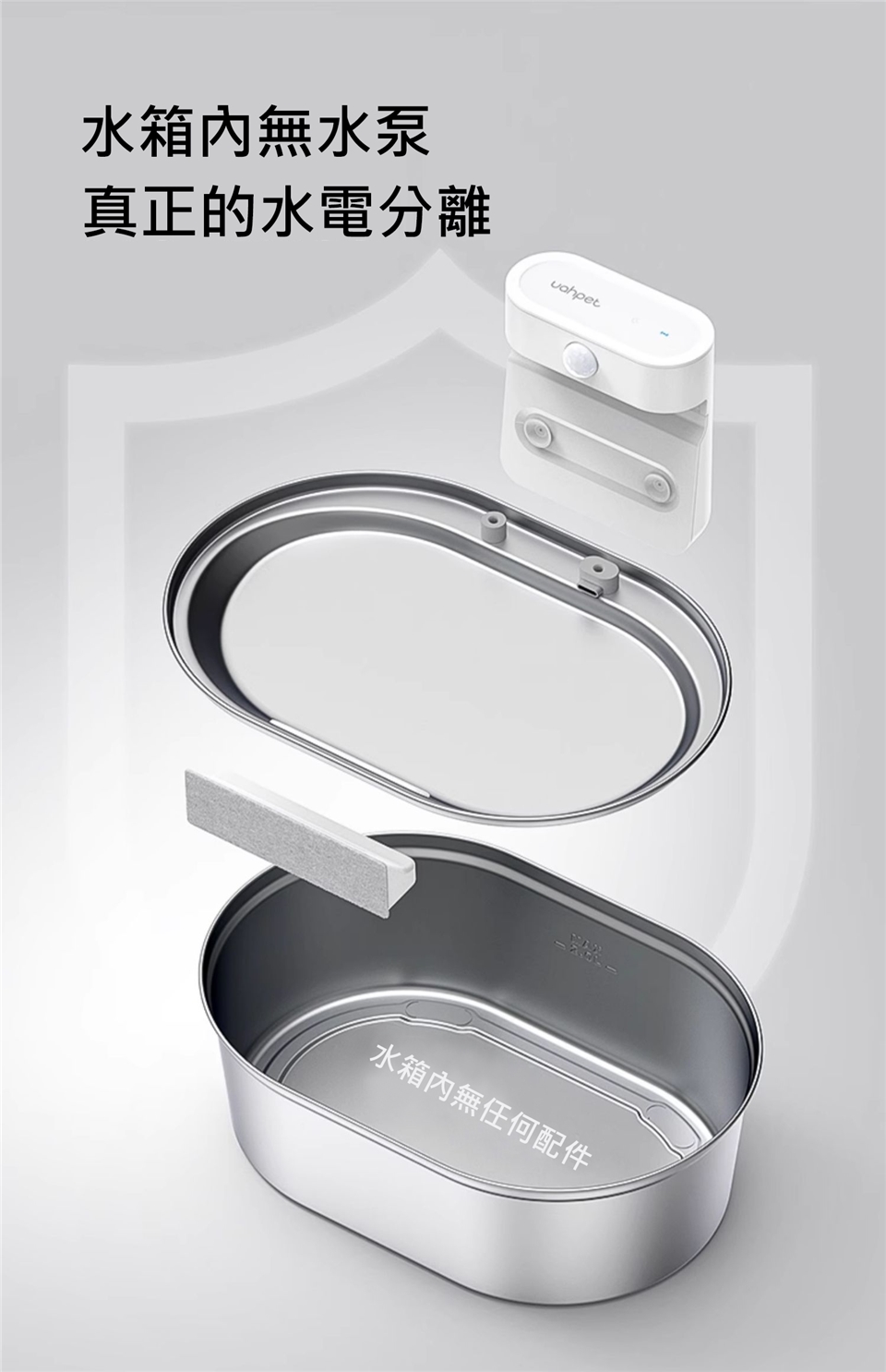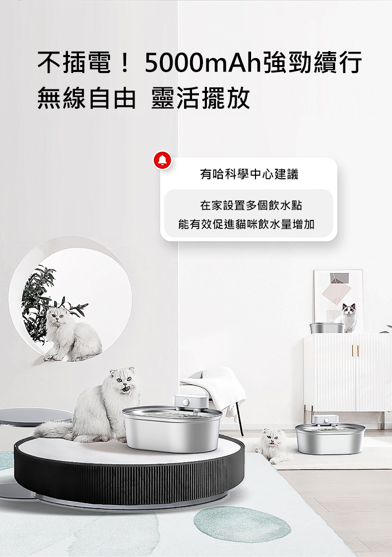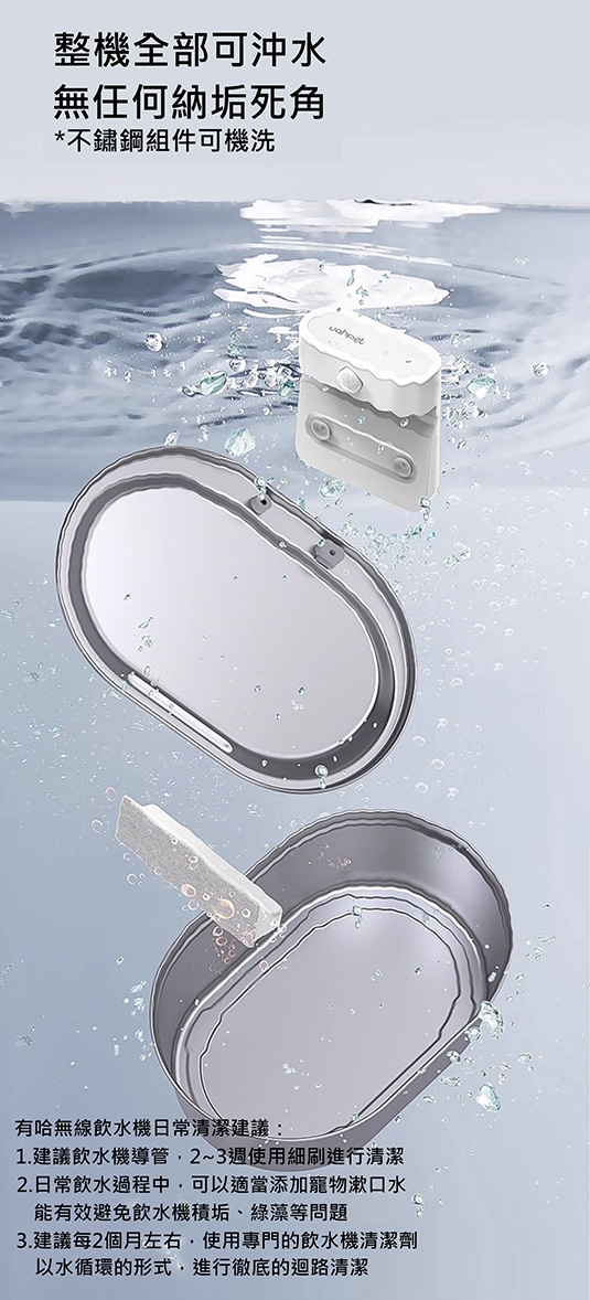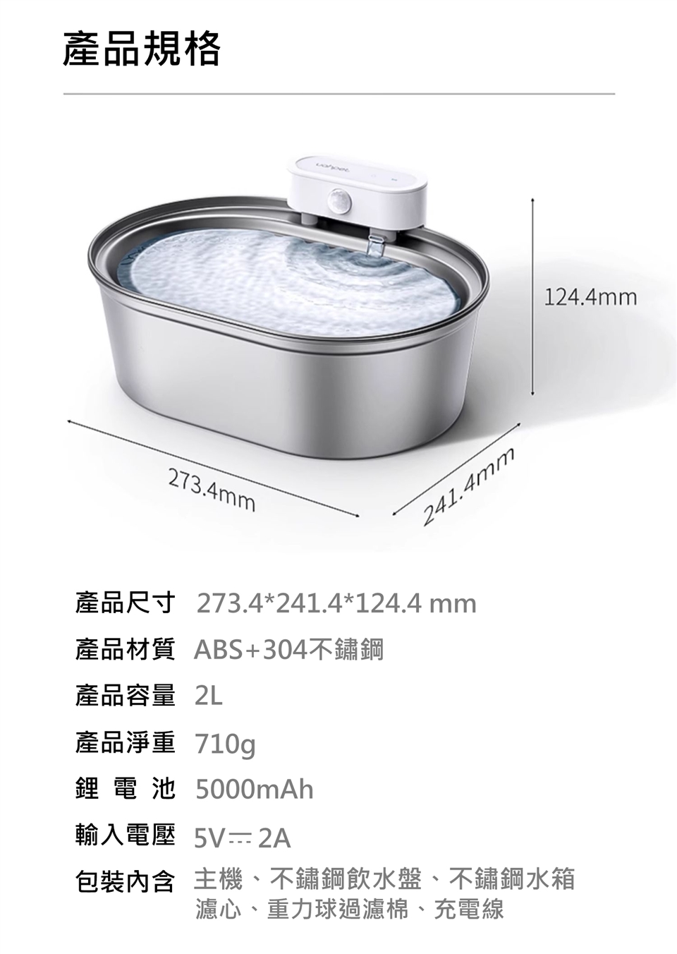 -主機、不鏽鋼飲水盤、銹鋼水箱、濾心、重力球過濾棉、充電線
