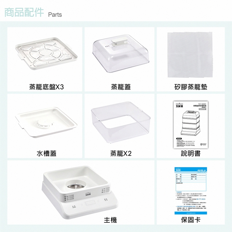 主 商 品:主機、水槽蓋、蒸籠底盤x3、蒸籠x2、蒸籠蓋