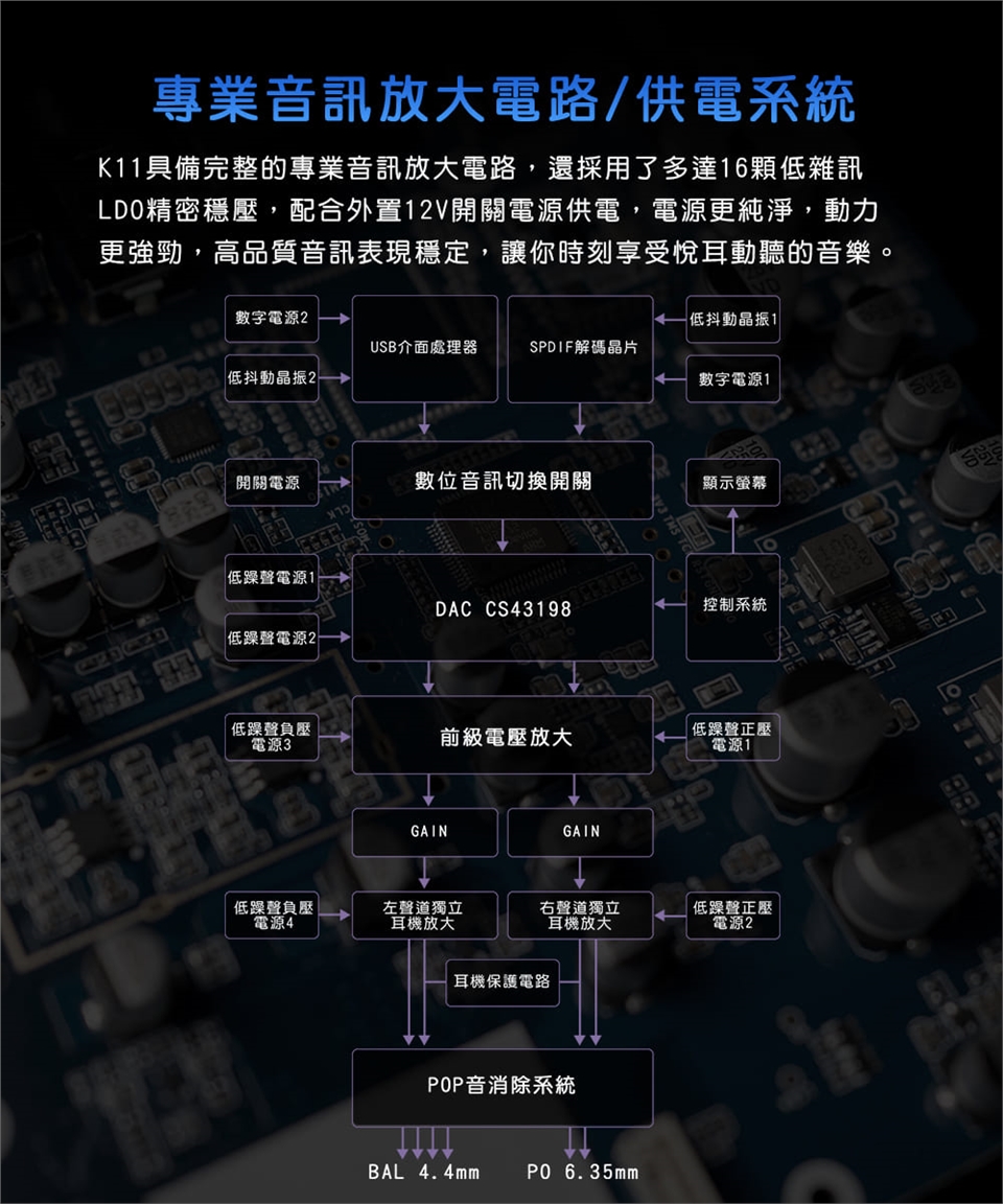 專業音訊放大及供電系統 | 具備完整的專業音訊放大電路,採用了多達16顆低雜訊LDO精密穩壓,配合外置12V開關電源供電,電源更純淨,動力更強勁。