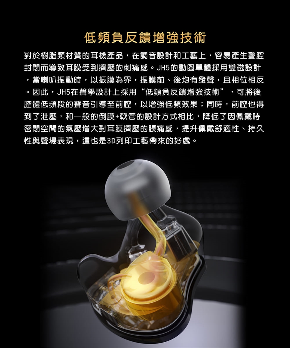 低頻負反饋增強技術 | 可將後腔體低頻段的聲音引導至前腔,以增強低頻效果;同時前腔也得到了泄壓,提升佩戴舒適性、持久性與聲場表現,這也是3D列印工藝帶來的好處。