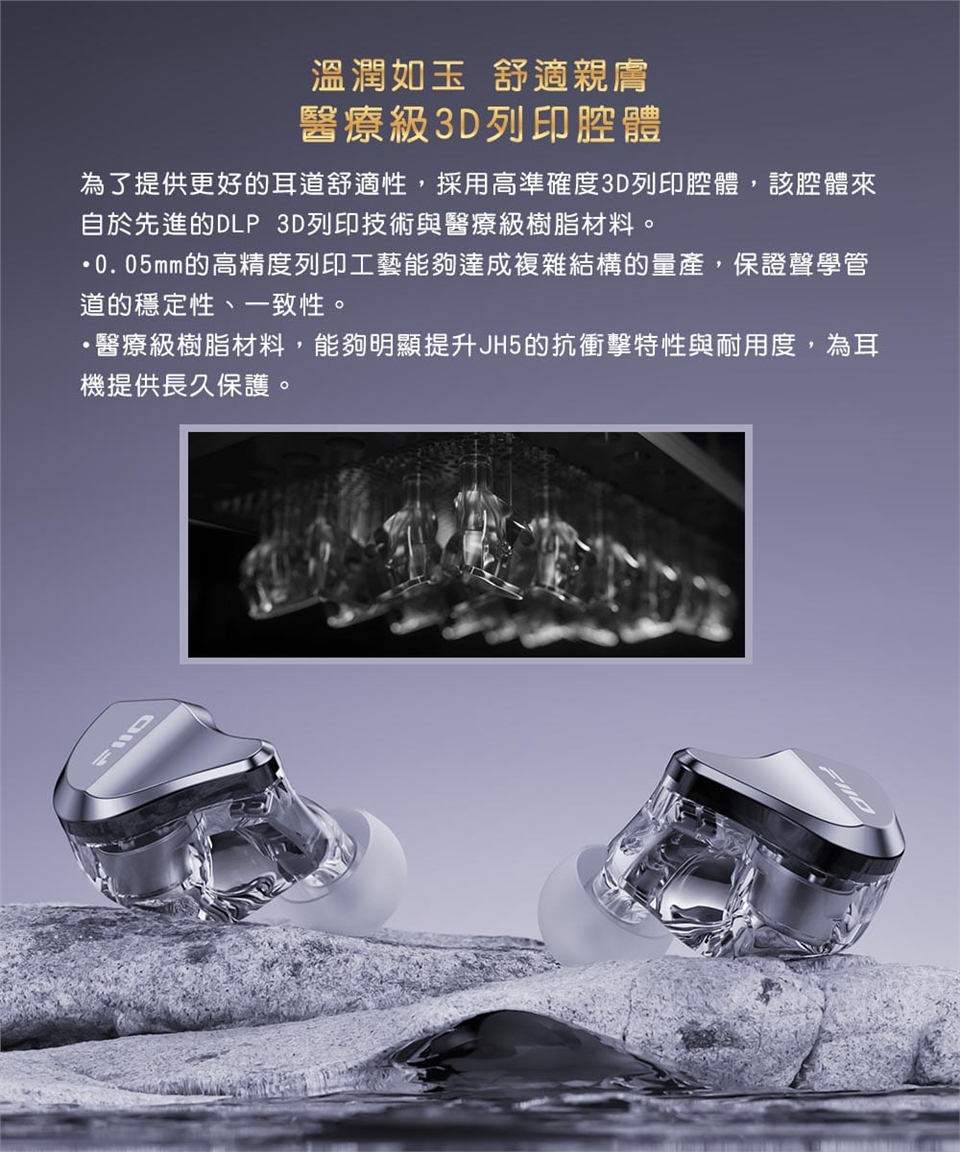 醫療級3D列印腔體 | 0.05mm的高精度列印工藝能夠達成複雜結構的量產,保證聲學管道的穩定性、一致性;醫療級樹脂材料,能夠明顯提升JH5的抗衝擊特性與耐用度。