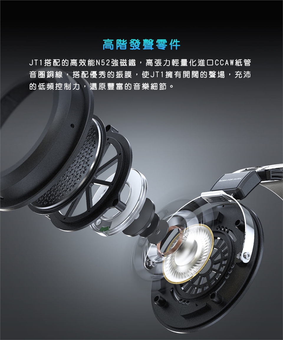 N52高效能磁體 | 搭配的高效能N52強磁鐵,高張力輕量化進口CCAW紙管音圈銅線,搭配優秀的振膜,使JT1擁有開闊的聲場,充沛的低頻控制力,還原豐富的音樂細節。