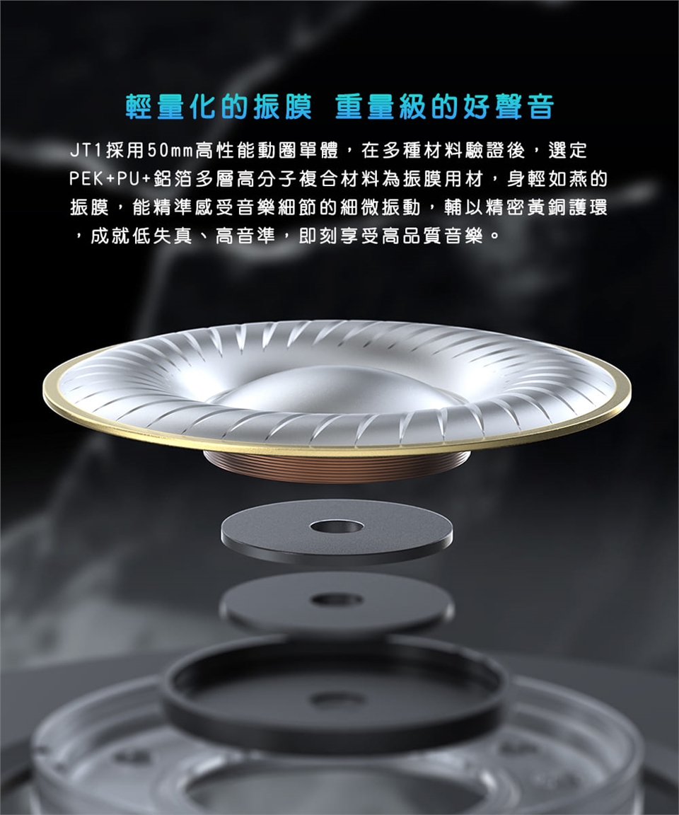 輕量化的音膜 | 採用50mm高性能動圈單體,在多種材料驗證後,選定PEK+PU+鋁箔多層高分子複合材料為振膜用材,輔以精密黃銅護環,成就低失真、高音準,即刻享受高品質音樂。