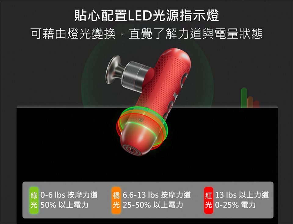 * LED光源指示燈~透過燈光變化了解電量及力道狀態