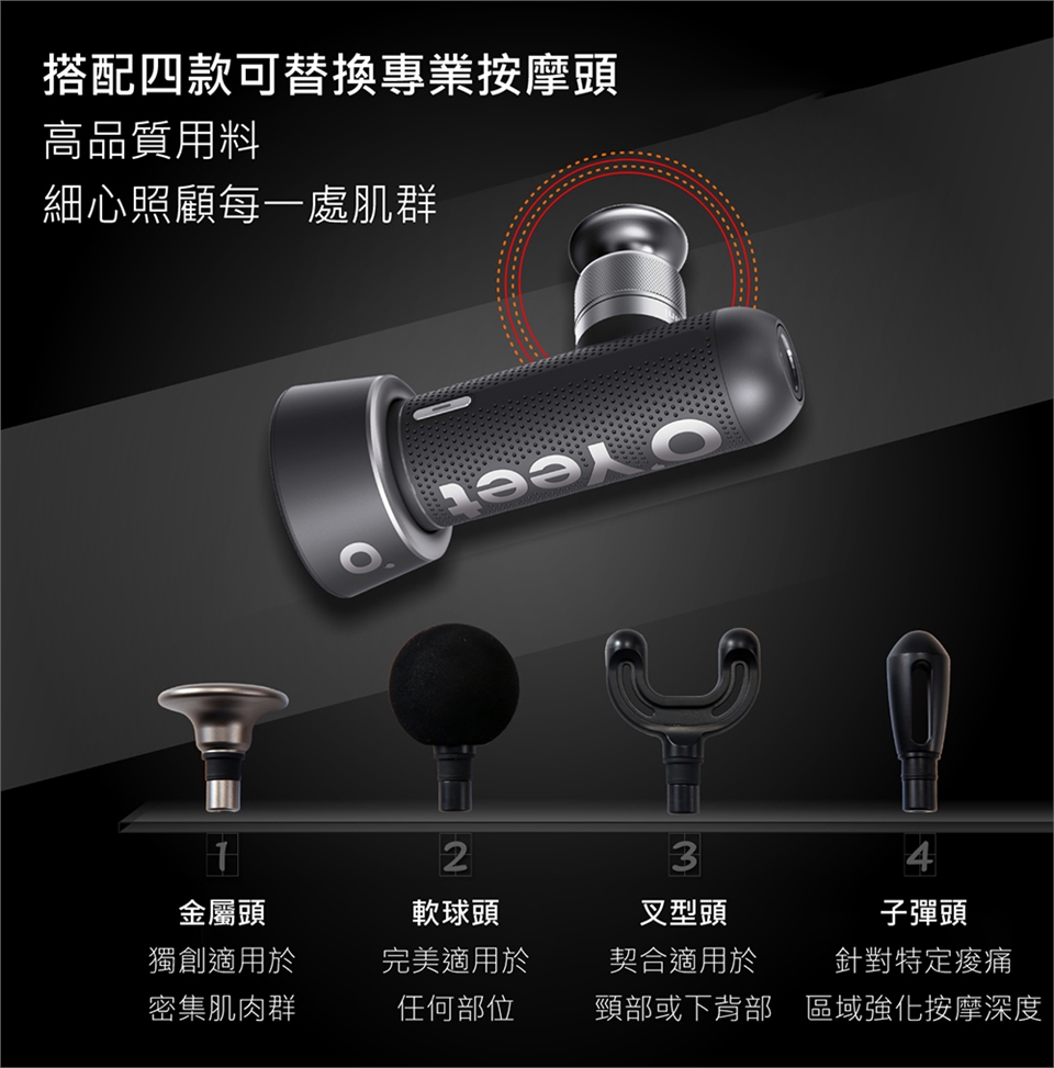 * 搭配4款專業按摩頭可供替換,照顧每一處肌群
