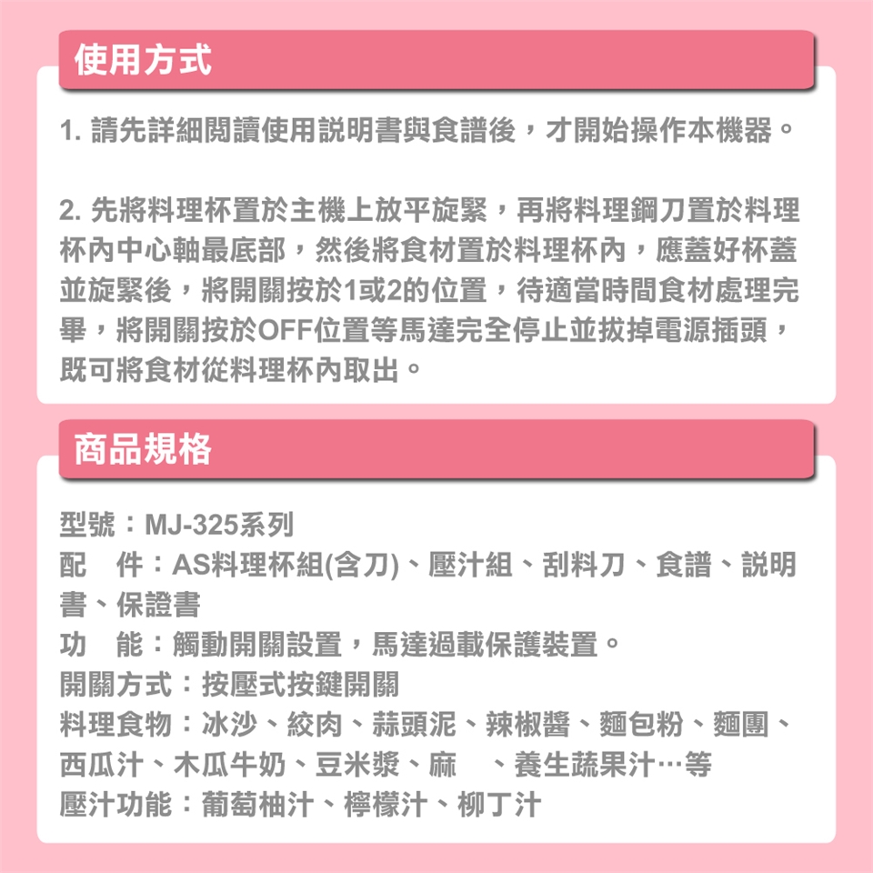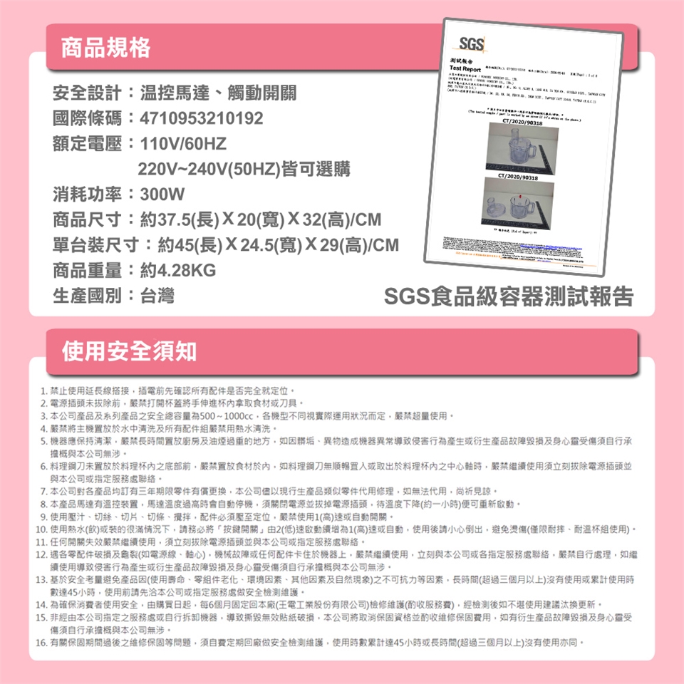 配 件:AS料理杯組(含刀)、壓汁組、刮料刀、食譜、說明書、保證書