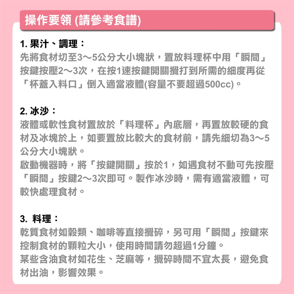 2.某些含油食材如花生、芝麻等,攪碎時間不宜太長,避免食材出油,影響效果。