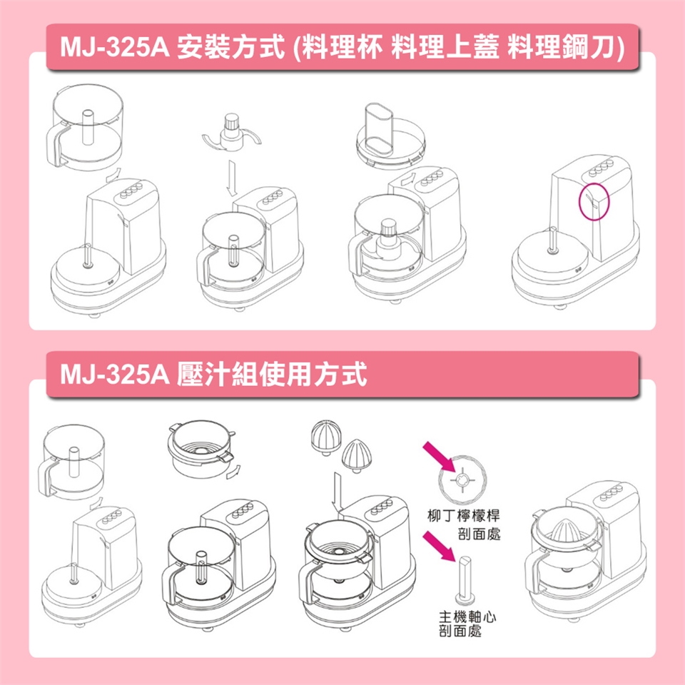 3)壓汁.切絲.切片.切條.攪拌:使用時必須將配件壓至定位,須用2速進行料理。